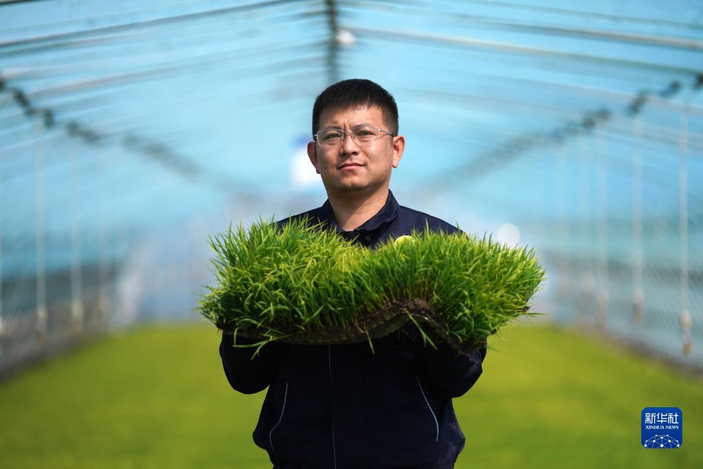 北大荒集團建三江分公司七星農場有限公司種植戶陸向導手捧水稻秧苗(2022年5月18日攝)。 新華社記者 王建威 攝