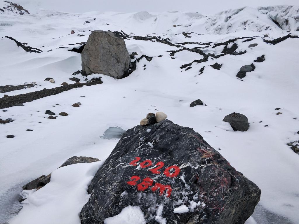 這是冰川監測隊2020年在冰川下做過標記的一塊石頭。(受訪者供圖)