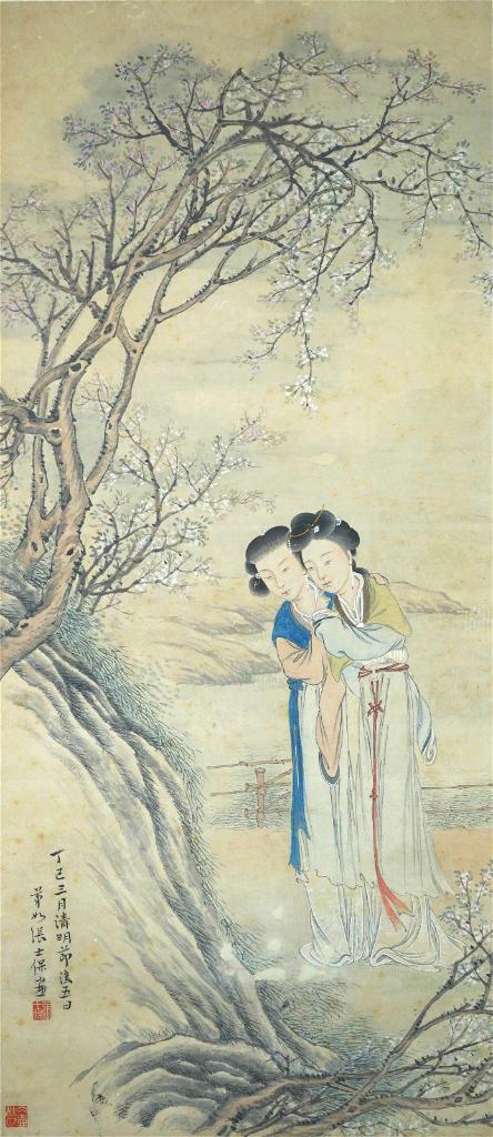 在北京藝術(shù)博物館,一幅長1米多、寬40多厘米的清代設色紙本,生動地描繪了古人清明踏青時的活動。畫面中梨花吐蕊,踏青賞春的兩位女子在岸邊土坡旁流連忘返。其中一人流珠柳簪斜插在發(fā)髻間,另一人則右耳邊插朵花柳簪。畫左下側(cè)落款:丁巳三月清明節(jié)后五日。
