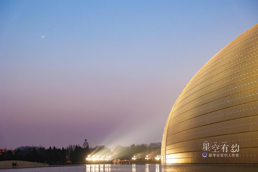 北京市天文攝影愛好者王俊峰2023年2月22日在北京西城拍攝的金星伴月。(本人供圖)