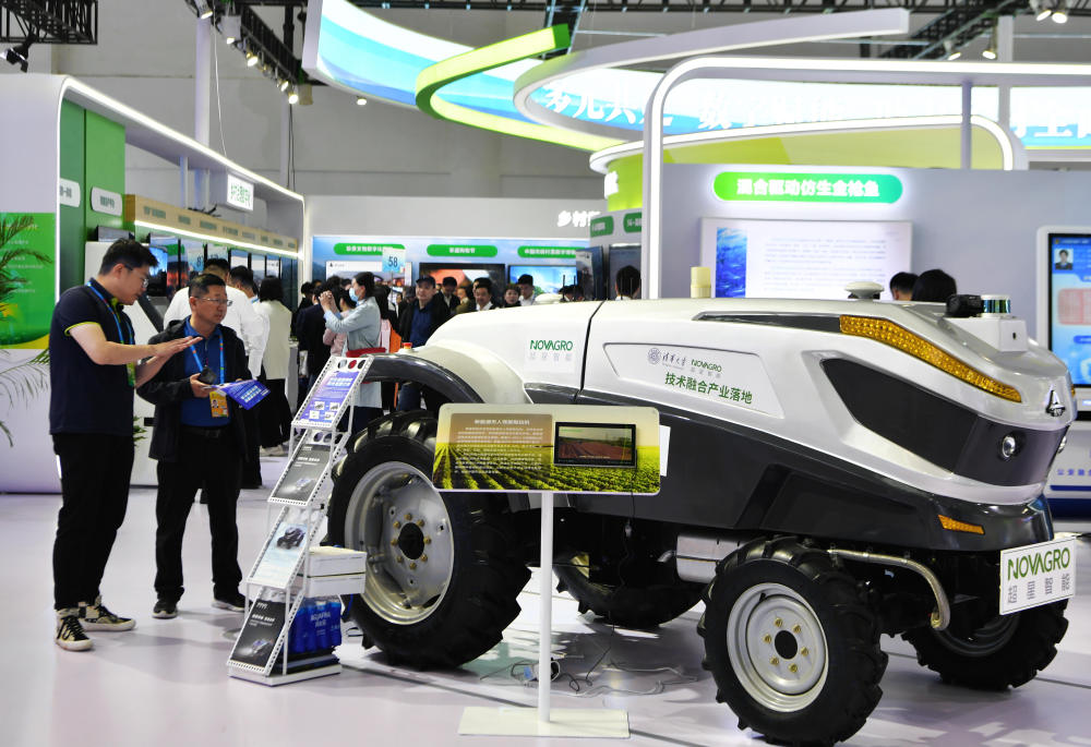在第六屆數字中國建設峰會智慧農業展廳展出的新能源無人駕駛智能拖拉機吸引參觀者駐足觀看(4月26日攝)。新華社記者 魏培全 攝