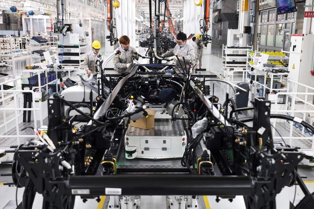 3月30日,工作人員在位于吉林長春的一汽解放J7智能工廠內進行整車裝配作業。新華社記者 許暢 攝