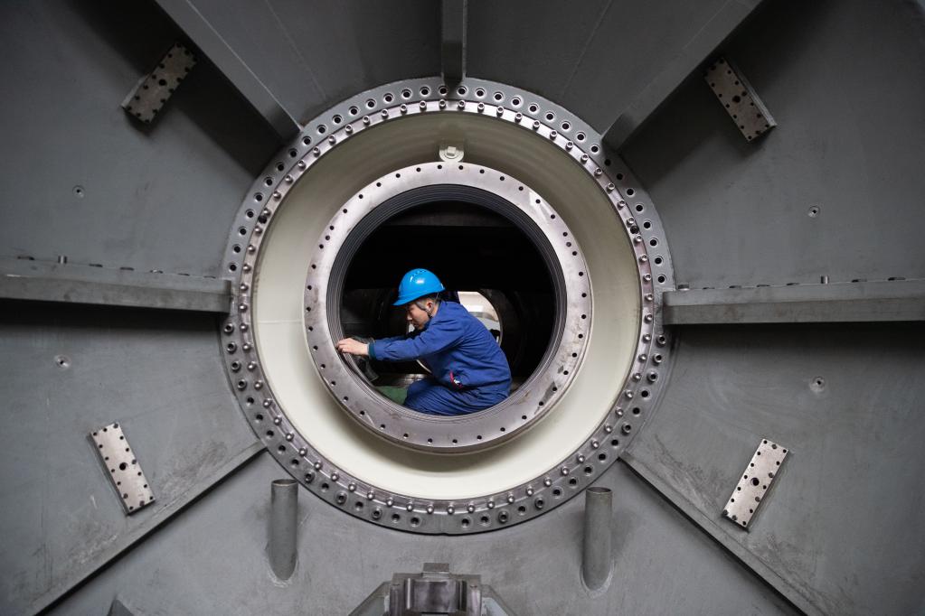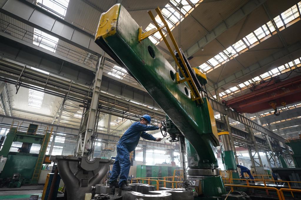 4月28日,工人在哈電集團哈爾濱汽輪機廠有限責任公司車間內生產作業。新華社記者 張濤 攝