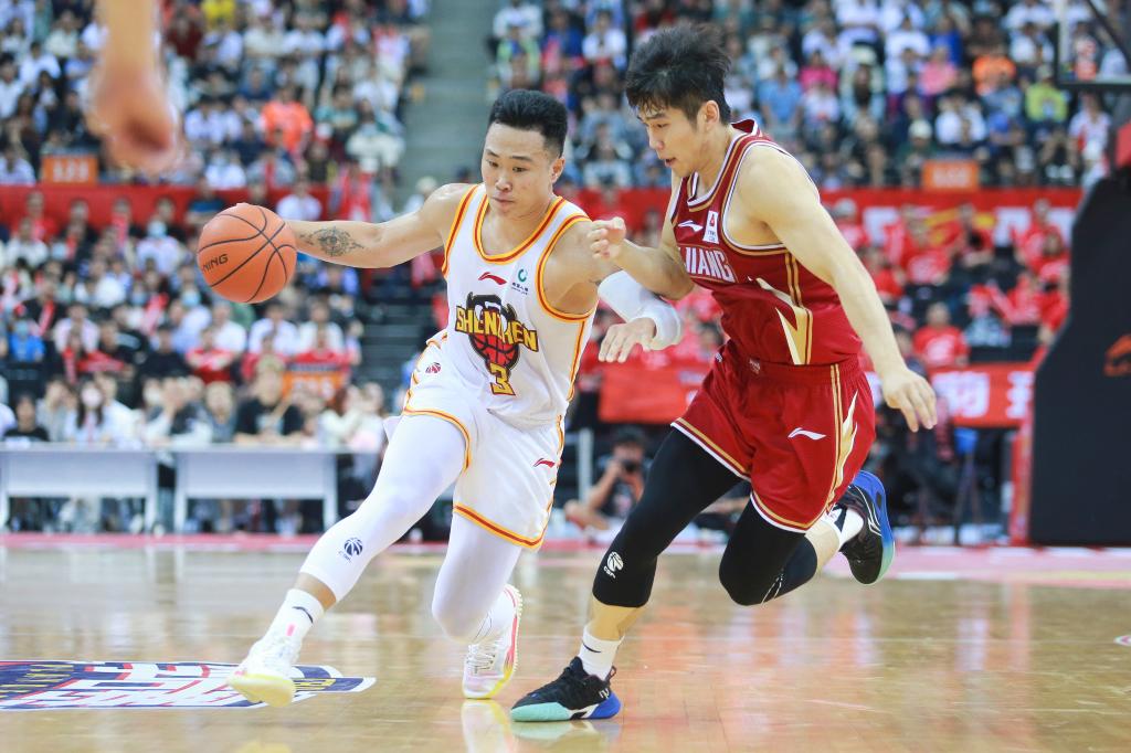 4月30日,深圳隊球員賀希寧(左)在比賽中帶球突破。新華社發(彭志剛攝)
