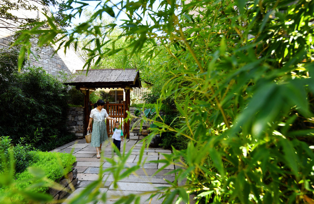 游客行走在西安市長安區秦嶺終南山腳下的一個民宿內(2022年7月24日攝)。新華社記者 劉瀟 攝