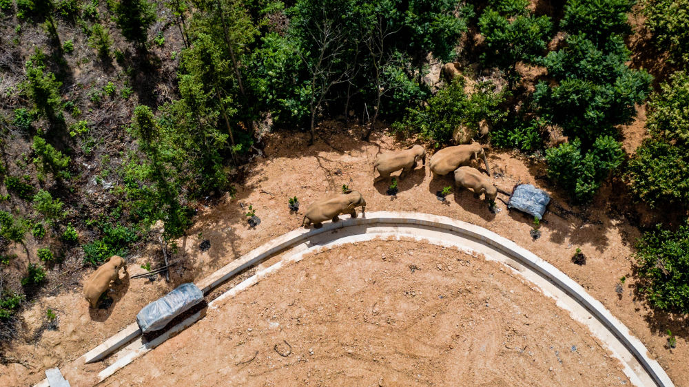 在云南省玉溪市峨山縣境內(nèi)拍攝的北遷象群(2021年5月28日攝,無(wú)人機(jī)照片)。新華社記者 胡超 攝