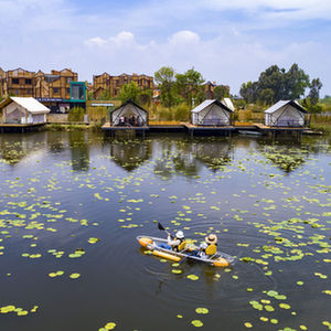 游人在滇池南岸晉寧區(qū)上蒜鎮(zhèn)小漁村劃船休閑(2023年4月30日攝,無(wú)人機(jī)照片)。新華社記者 陳欣波 攝