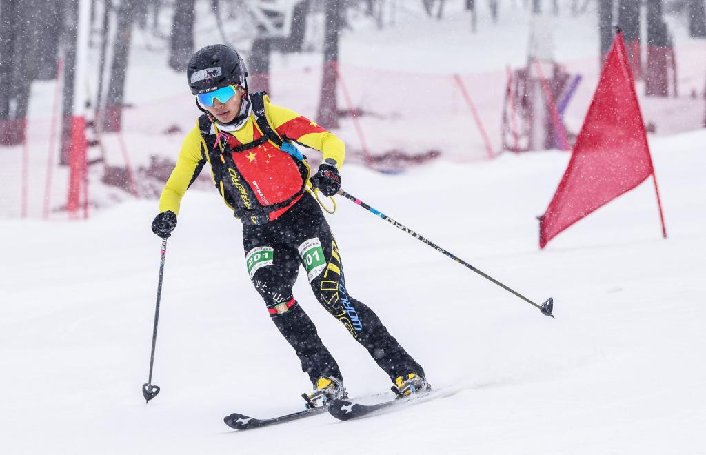 4月8日,玉珍拉姆在新疆富蘊縣可可托海國際滑雪度假區參加全國首屆滑雪登山冠軍賽短距離(女子組)比賽。新華社記者胡虎虎攝