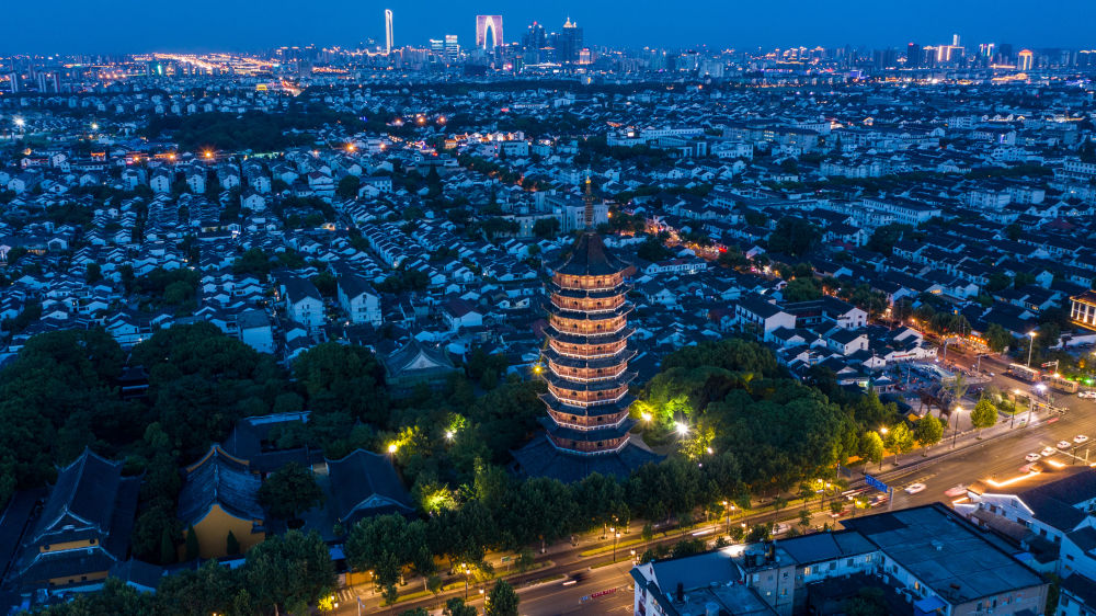 這是2020年8月24日在蘇州市姑蘇區拍攝的城區夜景(無人機照片)。新華社記者 李博 攝
