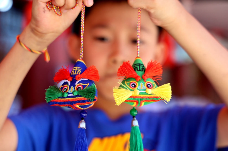6月22日,在山東省濱州市無棣縣古城風景區,小朋友展示選購的香囊。新華社發(初寶瑞 攝)