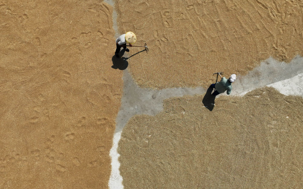 6月15日,在山東省淄博市農邦邦糧食烘干收儲服務有限公司的曬場上,工人晾曬糧食。新華社記者 陳灝 攝