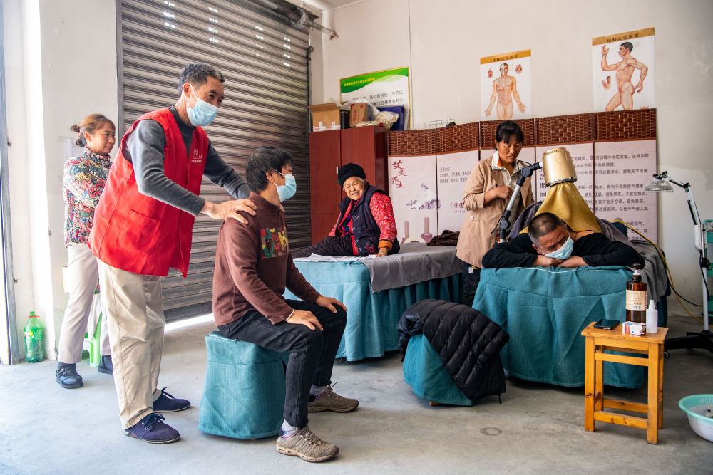 在重慶市綦江區(qū)安穩(wěn)鎮(zhèn)崇河村由當?shù)孛裾块T建立的普惠養(yǎng)老場所“自然健康屋”,志愿者為老人提供免費理療服務(2022年10月18日攝)。新華社記者 唐奕 攝