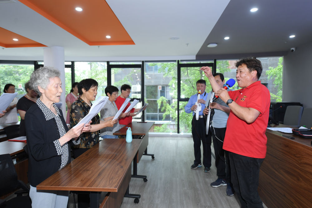 在浙江省湖州市愛山街道利民社區(qū),一個公益組織的聲樂老師和樂手帶領老年居民開展合唱活動(2023年5月29日攝)。新華社記者 翁忻旸 攝
