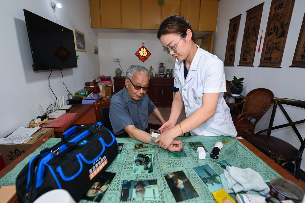 家庭醫(yī)生上門為住在浙江省嘉興市秀洲區(qū)新塍鎮(zhèn)蓬萊社區(qū)的83歲獨居老人孫志龍測量血壓(2023年6月15日攝)。新華社記者 徐昱 攝