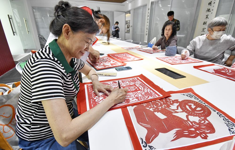 北京朝陽無限社區(qū)的老年人在社區(qū)養(yǎng)老驛站參加剪紙活動(2023年5月17日攝)。新華社記者 李欣 攝