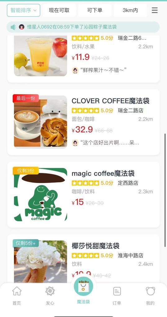 記者在上海登錄一個“盲盒”小程序,看到所在地周邊的部分商戶銷售一批名為“魔法袋”的產品,已經吸引多個餐飲品牌加入。平均售價只有十幾元的“食物盲盒”,包含了多個烘焙產品。記者隨機選購了一款“魔法袋”,到店取貨后看到,售價11.9元的“魔法袋”里有4個蛋撻、2個肉松蛋糕。如果按照原價購買,這些東西應該需要20多元。