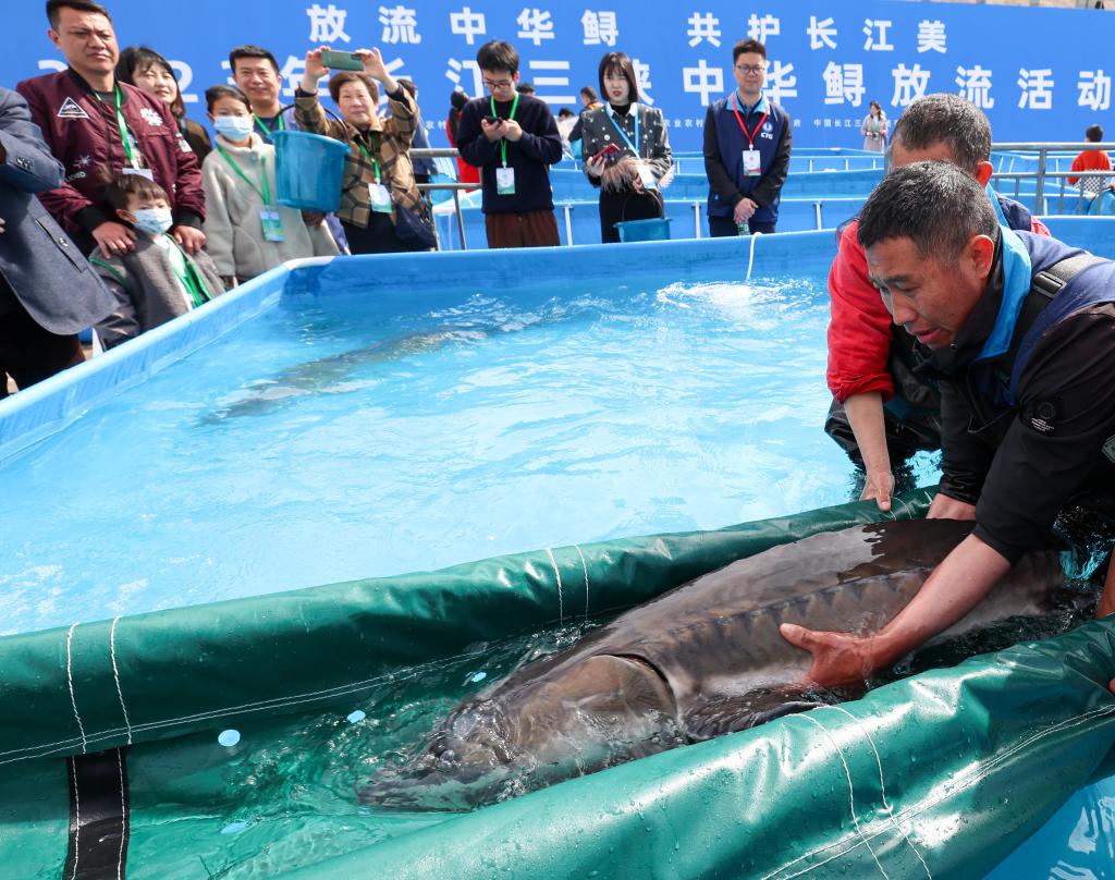 今年3月,10萬尾中華鱘在湖北省宜昌市胭脂園長江珍稀魚類放流點放歸長江。這是三峽集團聯合國內相關中華鱘保護機構,連續第68次開展流域化中華鱘放流。
