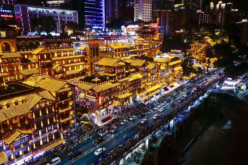 仲夏之夜,洪崖洞吊腳樓式建筑群臨江而立、攀巖直上,璀璨奪目的燈光,與熙熙攘攘的游客、鱗次櫛比的門店構成一幅熱氣騰騰的“山水不夜城”圖景。