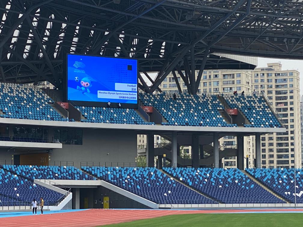 從位于溫州主城區(qū)西部的甌海區(qū)向東行,來到溫州體育中心體育場(chǎng)。該體育場(chǎng)建成已有十余年,當(dāng)?shù)貙?duì)場(chǎng)地設(shè)施設(shè)備進(jìn)行了提升改造,以符合亞運(yùn)賽事要求。一些提升運(yùn)動(dòng)員參賽和觀眾觀賽體驗(yàn)的“黑科技”就蘊(yùn)含在場(chǎng)地改造的細(xì)節(jié)里。