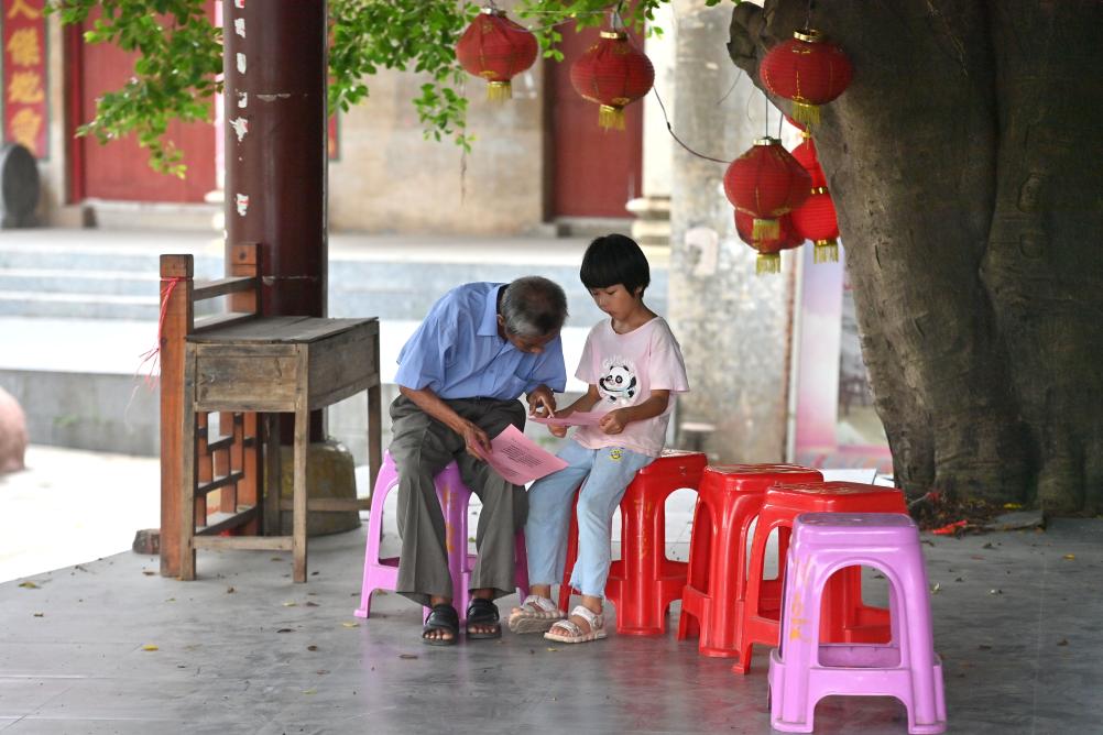在梧州市長洲區長洲鎮泗洲村,陳明仲(左)在教小學生唱下俚歌(8月24日攝)。