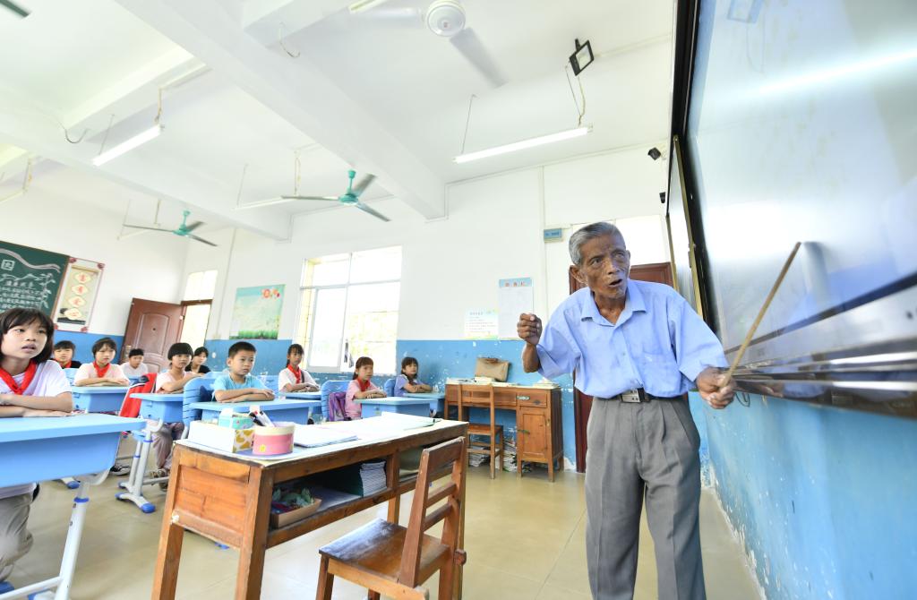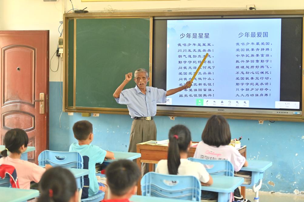 在梧州市長洲區長洲鎮泗洲小學,陳明仲在教孩子們唱下俚歌(9月5日攝)。