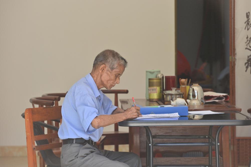 在梧州市長洲區長洲鎮泗洲村的家中,陳明仲在整理自己創作的下俚歌詞文稿(9月5日攝)。