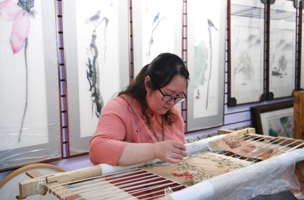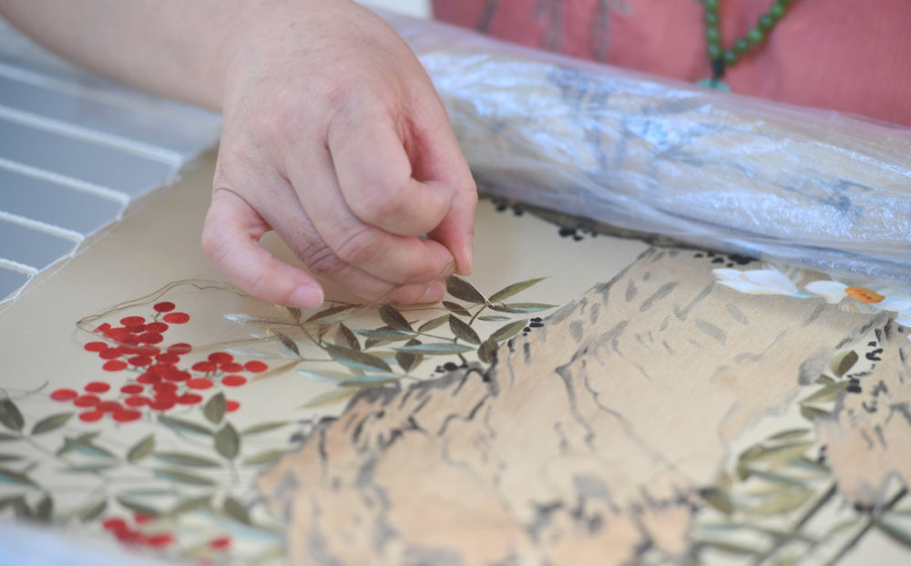國(guó)家級(jí)非遺保護(hù)項(xiàng)目汴繡傳承人程芳在制作汴繡作品(2023年6月20日攝)。新華社記者 張浩然 攝
