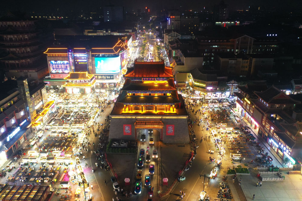 開(kāi)封鼓樓夜市(2023年6月20日攝,無(wú)人機(jī)照片)。新華社記者 張浩然 攝