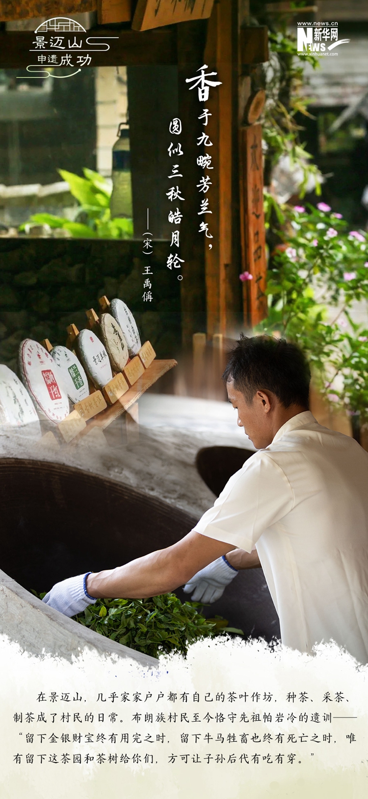 千百年來(lái),生活在景邁山的布朗族、傣族先民以古茶林為核心,對(duì)山區(qū)土地集約利用和合理布局,創(chuàng)造了“茶在林中”“村在茶中”“人茶共生”的智慧型山地人居環(huán)境。景邁山的古老傳奇,濃縮進(jìn)一杯茶里,香飄海內(nèi)外。而那些遠(yuǎn)銷五湖四海的“金葉”“銀葉”,又帶富了一方,回報(bào)著村民們的千年守護(hù)。