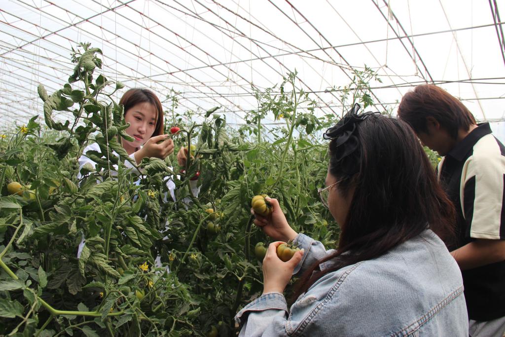 游客在天津市東麗區(qū)歡坨村的暖棚里采摘?dú)g坨西紅柿。(受訪者供圖)