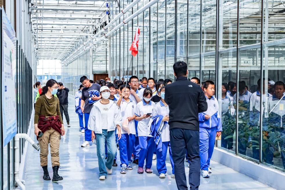 學(xué)生們在天津市東信花卉有限公司智能化溫室花卉種植基地參觀。(受訪者供圖)