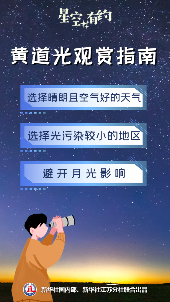 觀賞黃道光有一定技巧。王科超建議,首先應(yīng)盡量選擇晴朗且空氣質(zhì)量良好的天氣觀賞,這時(shí)大氣透明度較高。其次,應(yīng)選擇光污染較小的地區(qū)觀賞。第三,還要避開(kāi)月光的影響。今年秋分前后幾天,月光不會(huì)對(duì)觀測(cè)產(chǎn)生影響,對(duì)觀賞非常有利。