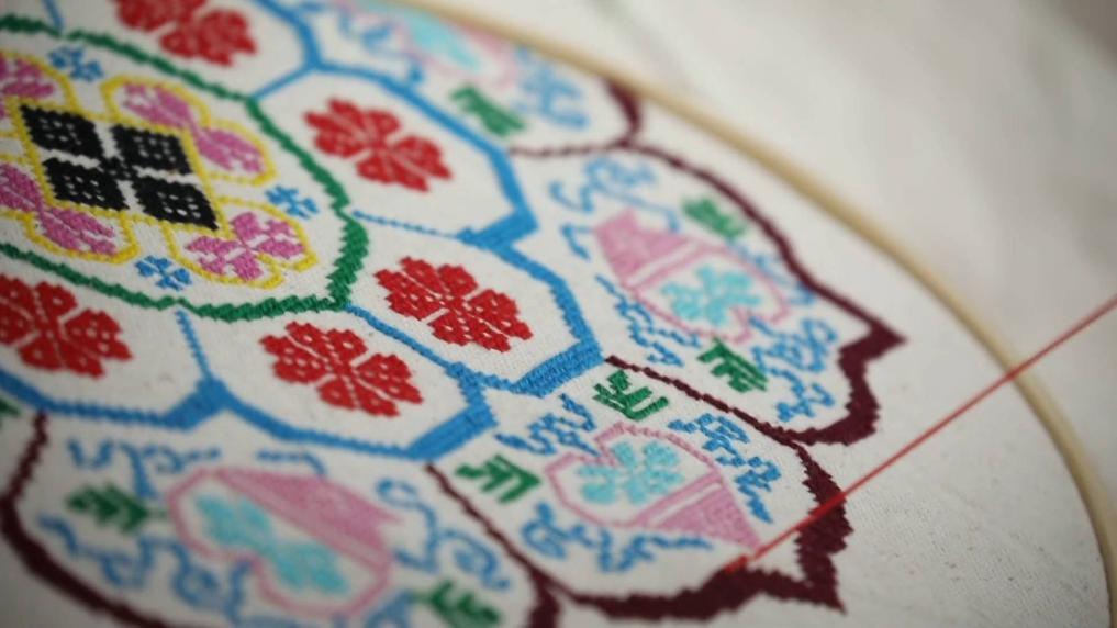 流行于陜西省漢中市城固縣一帶的城固架花,是陜西省非物質文化遺產項目。城固架花以白土布作底,以十字陣法為基礎,以花包花、疊加、對稱等獨特的表現(xiàn)手法,用針將五彩絲線繡在底布經線和緯線交織的網格上,形成色彩絢麗、立體感強的圖案。