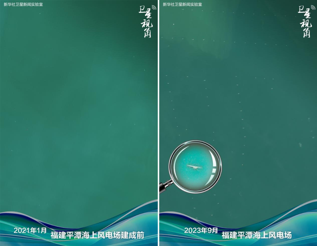 ↑2023年與2021年對比,一座座海上“擎天柱”屹立于福建平潭海上風電場。