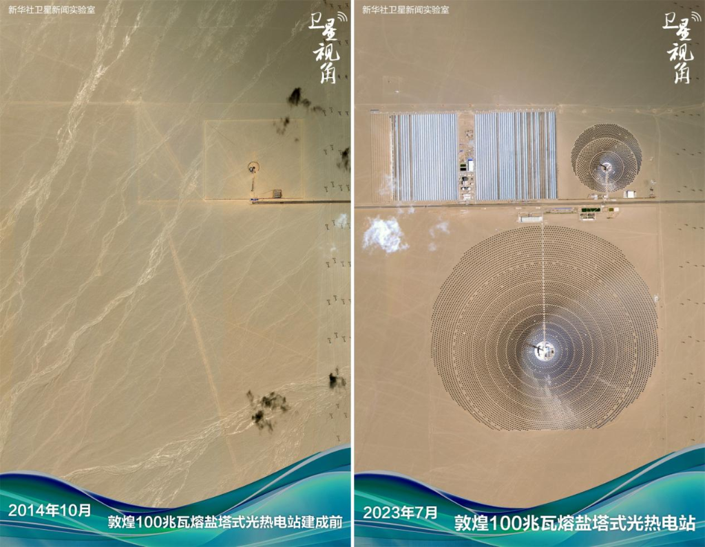 ↑2023年與2014年對比,敦煌戈壁灘上建起“超級鏡子發電站”。