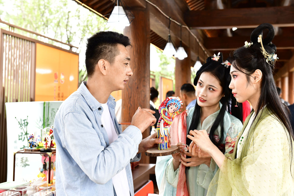 2023年9月26日,在第九屆尼山世界文明論壇“山東手造”精品展區,與會人員在介紹國家級非遺曹州面人作品。新華社記者 郭緒雷 攝