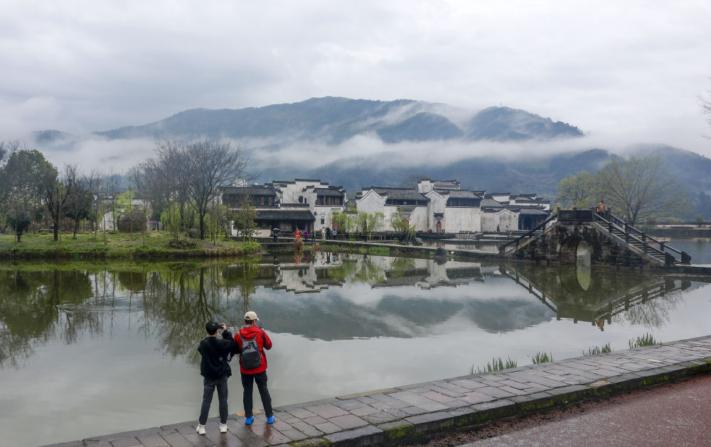 3月22日,游客在安徽省黃山市徽州區(qū)呈坎古村欣賞雨后春景。新華社發(fā)(施亞磊 攝)