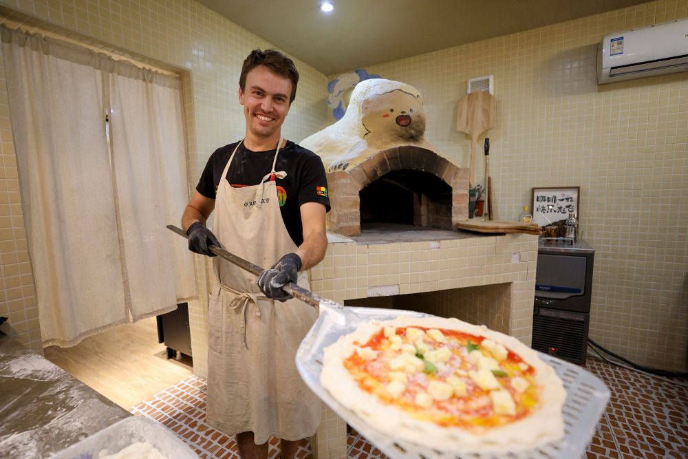 “在南溪南村開店,是因?yàn)橄蛲罩萏飯@生活,沒想到生意這么火,每天披薩供不應(yīng)求。”卓文說。隔壁開店的當(dāng)?shù)厝死蠀牵妥课氖恰拌F哥們”。