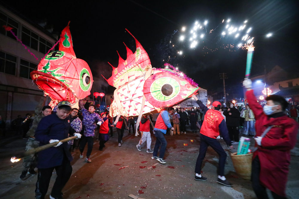 2月3日,在安徽省黃山市歙縣溪頭鎮(zhèn)汪滿田村,人們嬉魚燈。新華社發(fā)(樊成柱 攝)