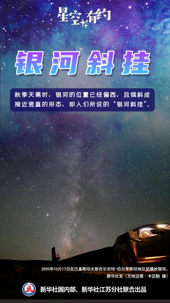 中國科學(xué)院紫金山天文臺科普主管王科超介紹,人們常用“飛馬當空,銀河斜掛”來概括秋季星空的特點。整個秋天,人們?nèi)匀荒芸吹姐y河懸掛在天空。不過,銀河升起的時間較夏季變早。秋季天黑時,銀河的位置已經(jīng)偏西,且傾斜成接近豎直的形態(tài),即人們所說的“銀河斜掛”。