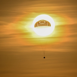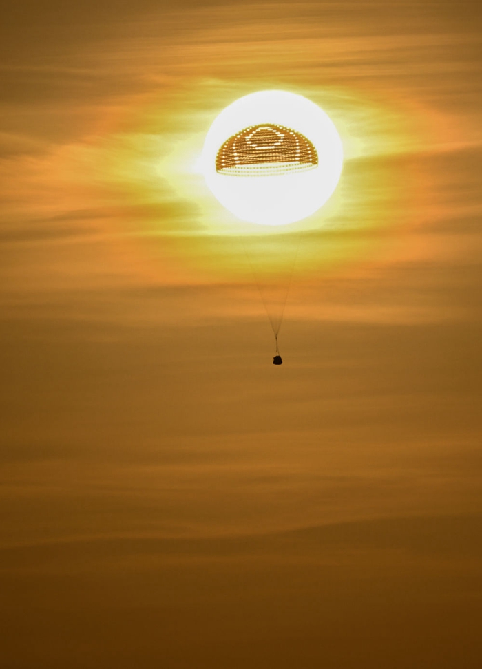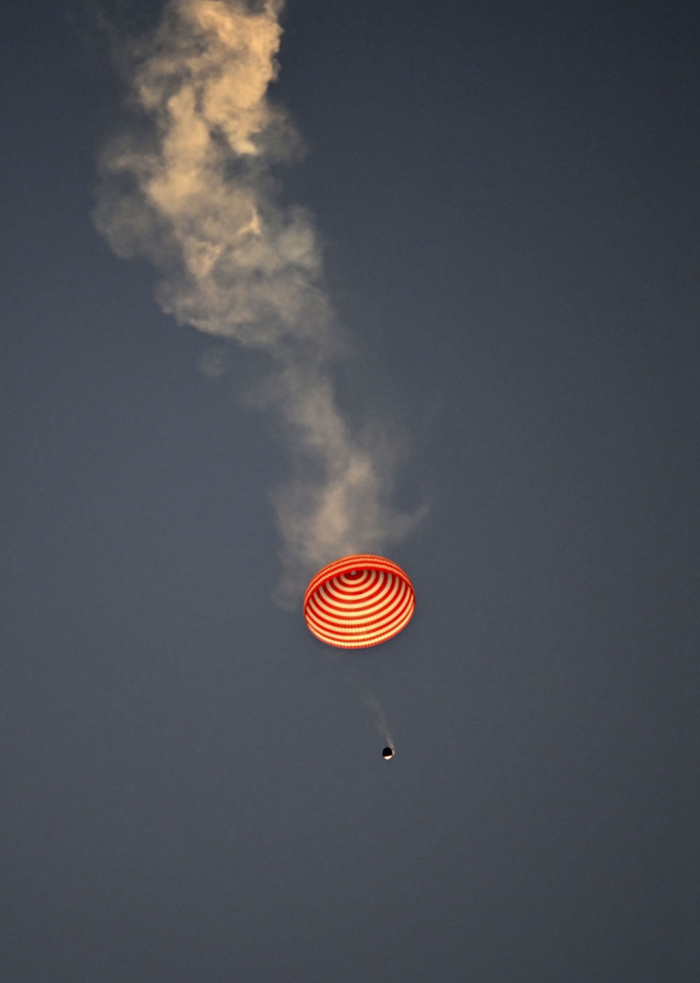 清晨,天已大亮。“嘭”地一聲,天空中傳來返回艙開傘的聲音。