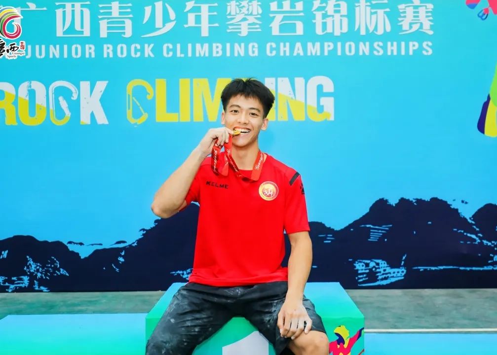 圖為馬山攀巖運動員零勇志在一次比賽中獲得金牌