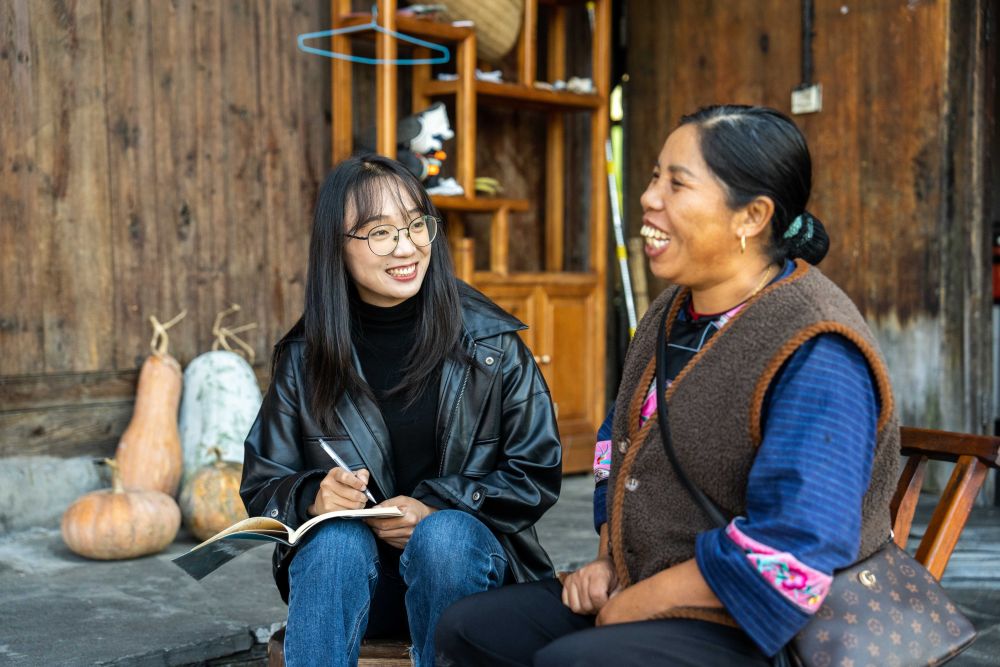 在湘西十八洞村,駐村干部杜霽(左)在走訪村民(2023年11月1日攝)。新華社記者陳思汗攝