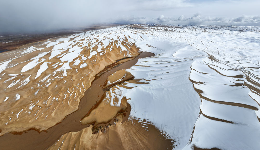2023年10月16日在新疆阿爾金山國家級自然保護區拍攝的白雪覆蓋的大沙子泉(無人機照片)。新華社記者 李響 攝