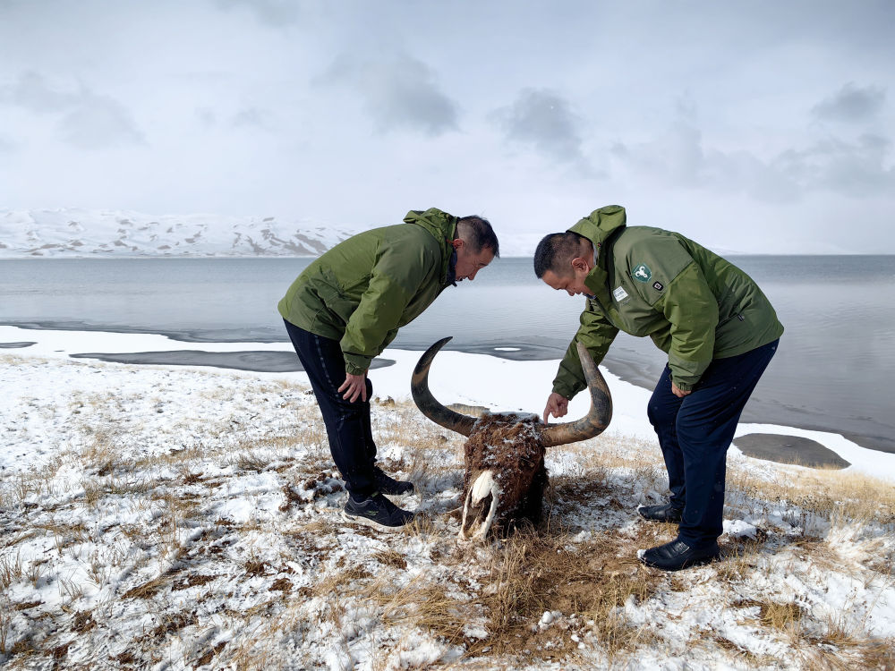 2023年10月16日,巡護員在新疆阿爾金山國家級自然保護區內查看死亡野牦牛的頭骨。新華社記者 李響 攝