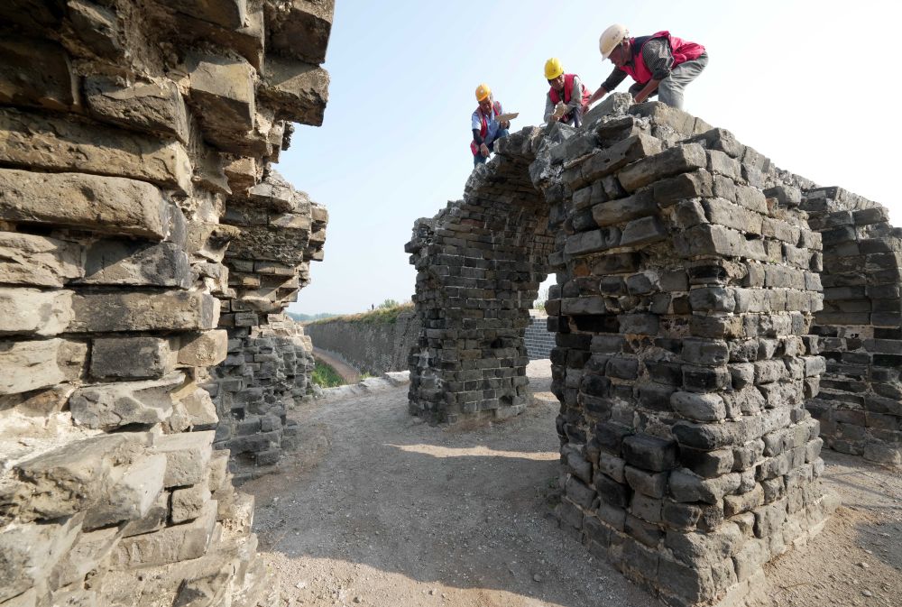 2023年6月15日,工人在山海關長城修繕工地施工。新華社記者 楊世堯 攝