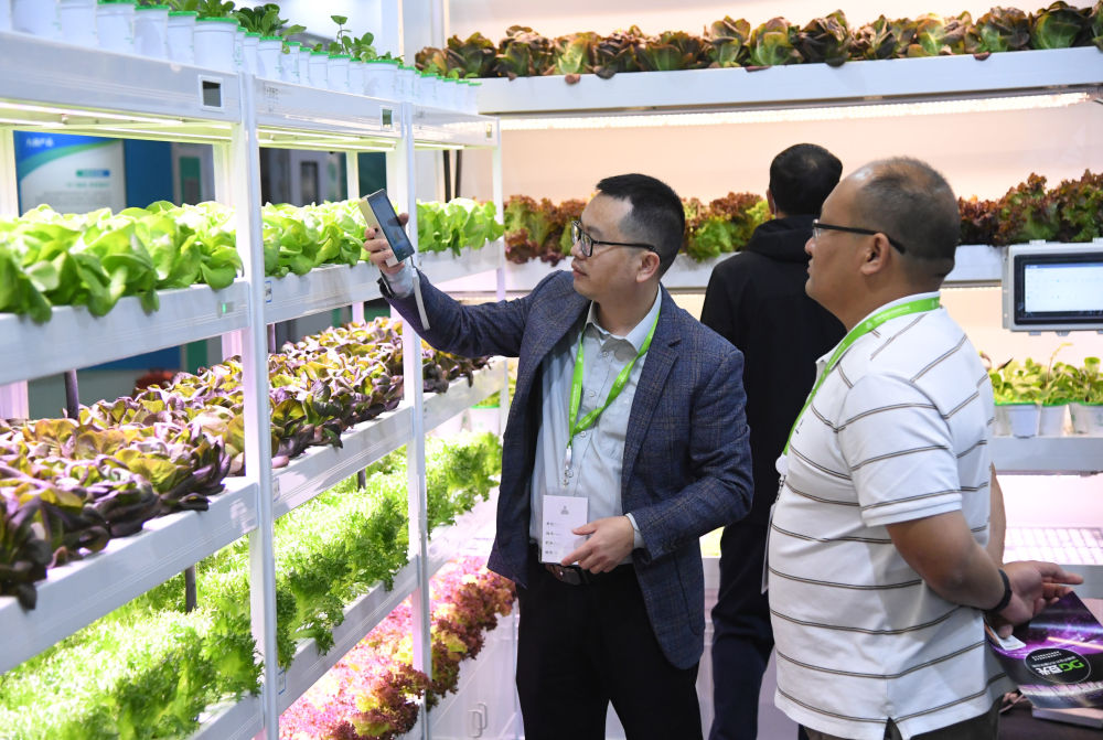 2023世界農業科技創新大會11月2日至4日在北京舉行。這是2023年11月2日,工作人員(左)在世界農業科技博覽會現場介紹智慧植物工廠。新華社記者 任超 攝