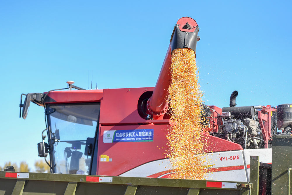 在中國科學院“黑土糧倉”科技會戰長春示范區公主嶺示范基地,無人駕駛農機將收獲的玉米裝車(2023年10月19日攝)。新華社記者 張楠 攝