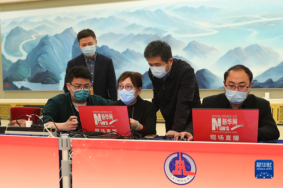 3月5日下午3時,全國政協(xié)十四屆一次會議在人民大會堂三樓金色大廳舉行民主黨派中央和全國工商聯(lián)領(lǐng)導人記者會,請各民主黨派中央主席和全國工商聯(lián)主席出席并回答記者提問。圖為現(xiàn)場直播團隊正在進行直播。新華網(wǎng)記者 焦鵬 攝