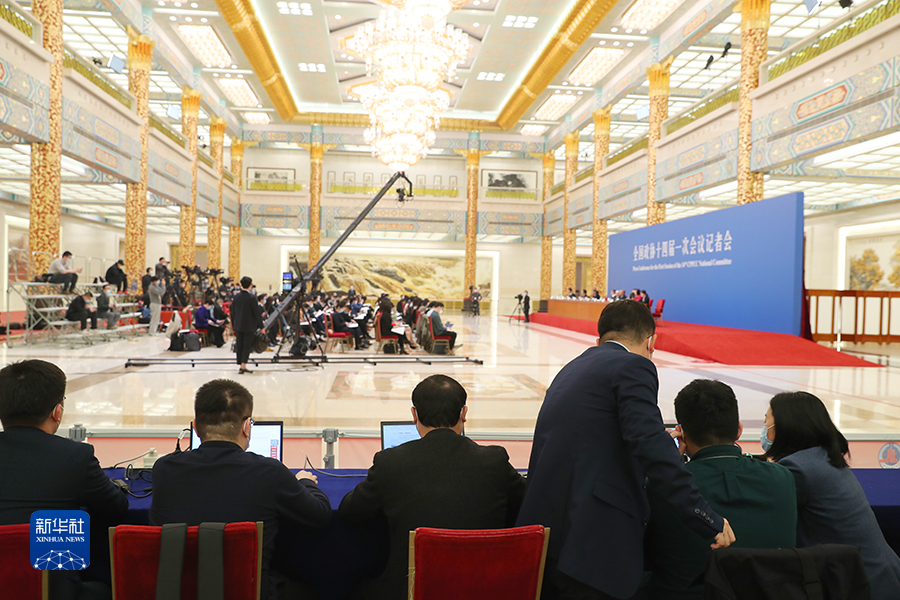 3月5日下午3時,全國政協十四屆一次會議在人民大會堂三樓金色大廳舉行民主黨派中央和全國工商聯領導人記者會,請各民主黨派中央主席和全國工商聯主席出席并回答記者提問。圖為現場直播團隊正在進行直播。新華網記者 焦鵬 攝